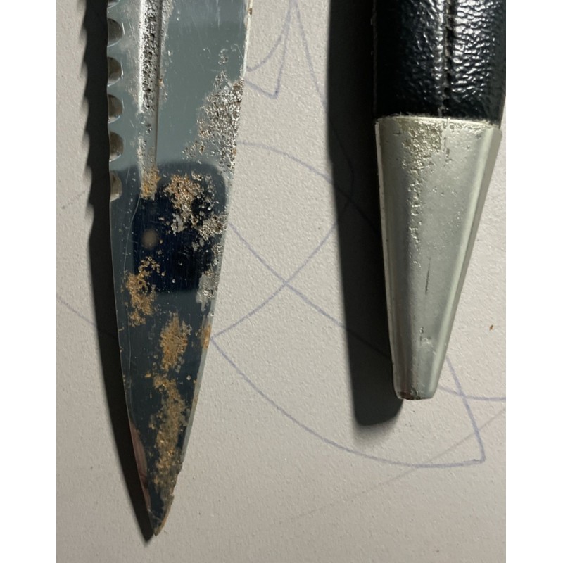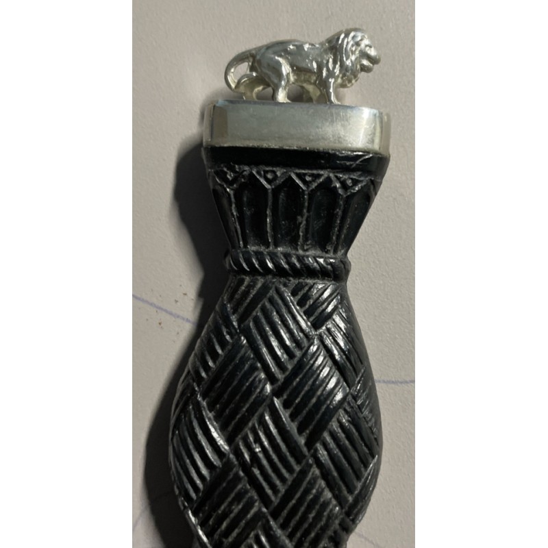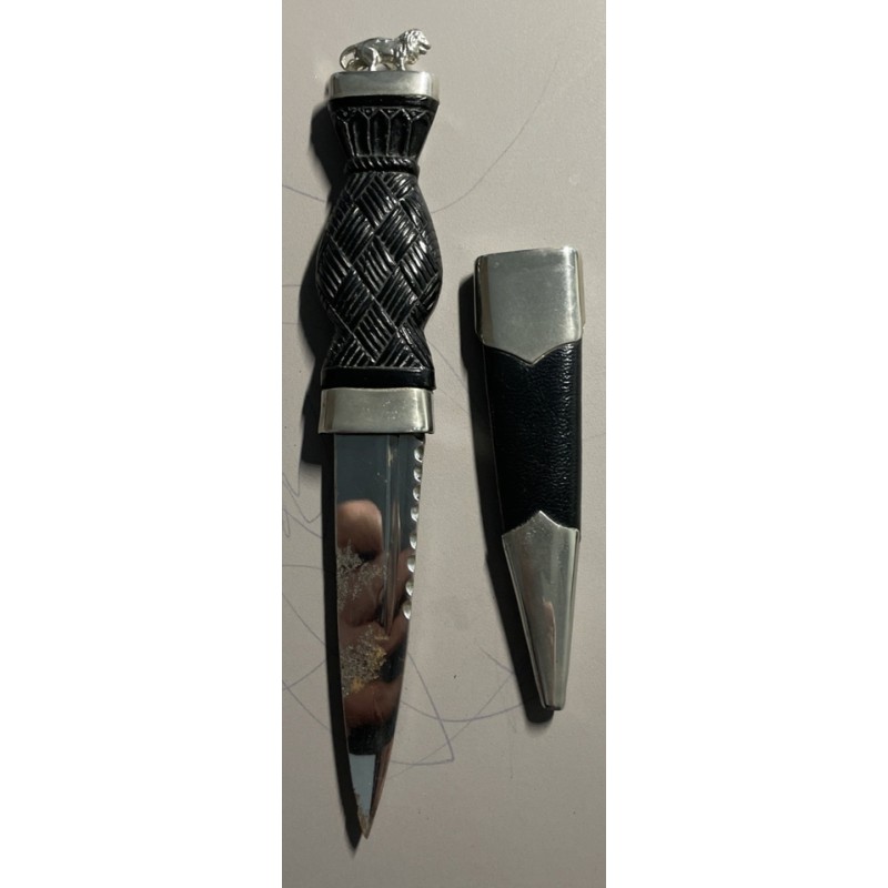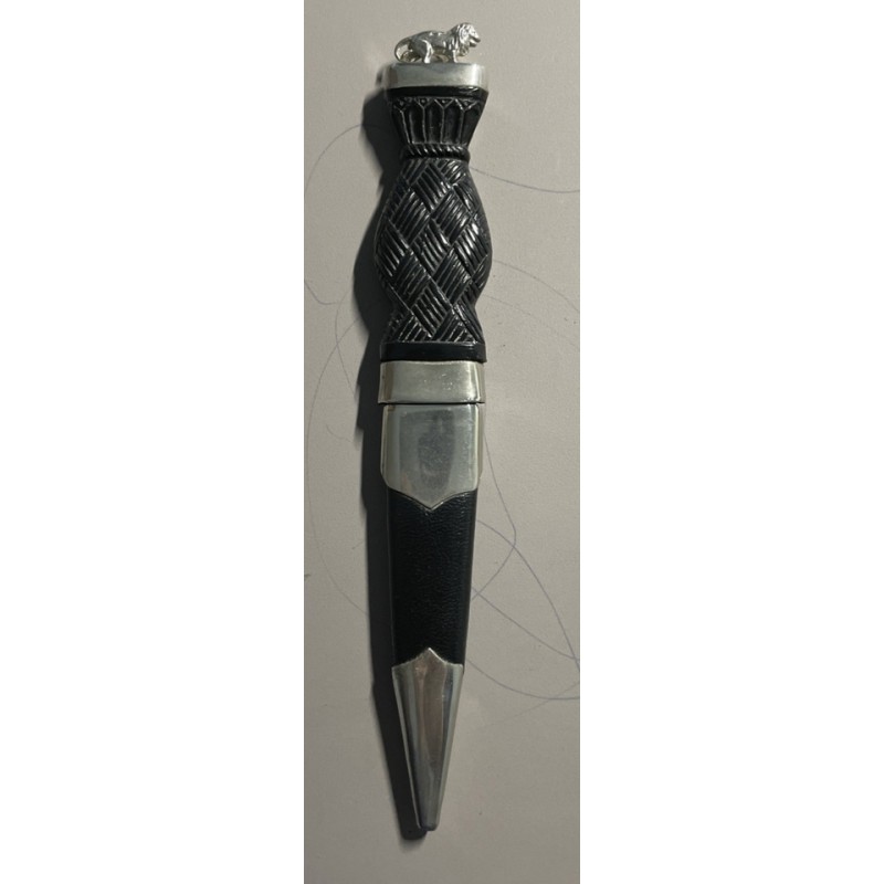 This Skene Dhu is unusual as it has a walking lion set to pommel instead of the more usual stone. There is a basket weave handle, a leather covered scabbard with a simple plain shield mounts and ball terminal. Good condition. apart from some tarnishing on the stainless steel blade. Only ever used for decorative purposes.